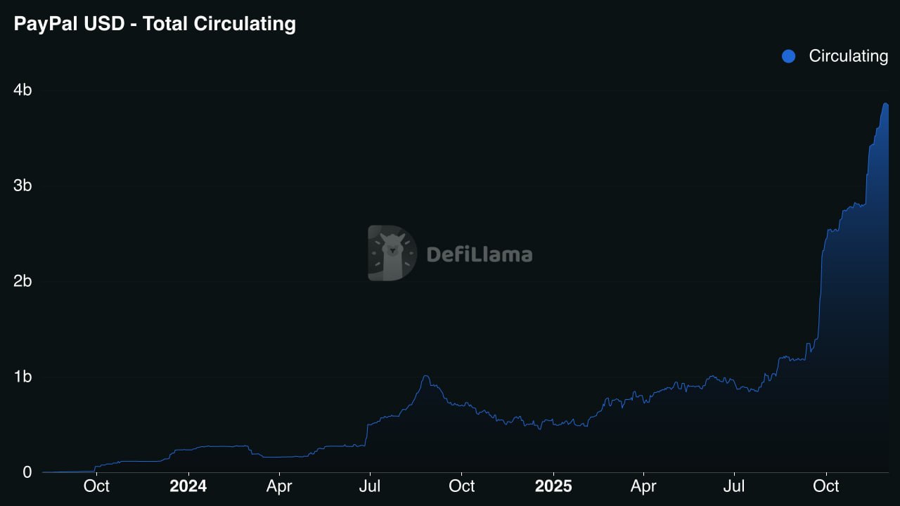吴说获悉,据 DeFiLlama 数据,PayPal 稳定币 PYUSD 供应量急速增长,从 9 月的 12 亿美元市值飙升至当前的超过 38 亿美元。PYUSD 已是第六大稳定币,过去一个月增长超 36%。