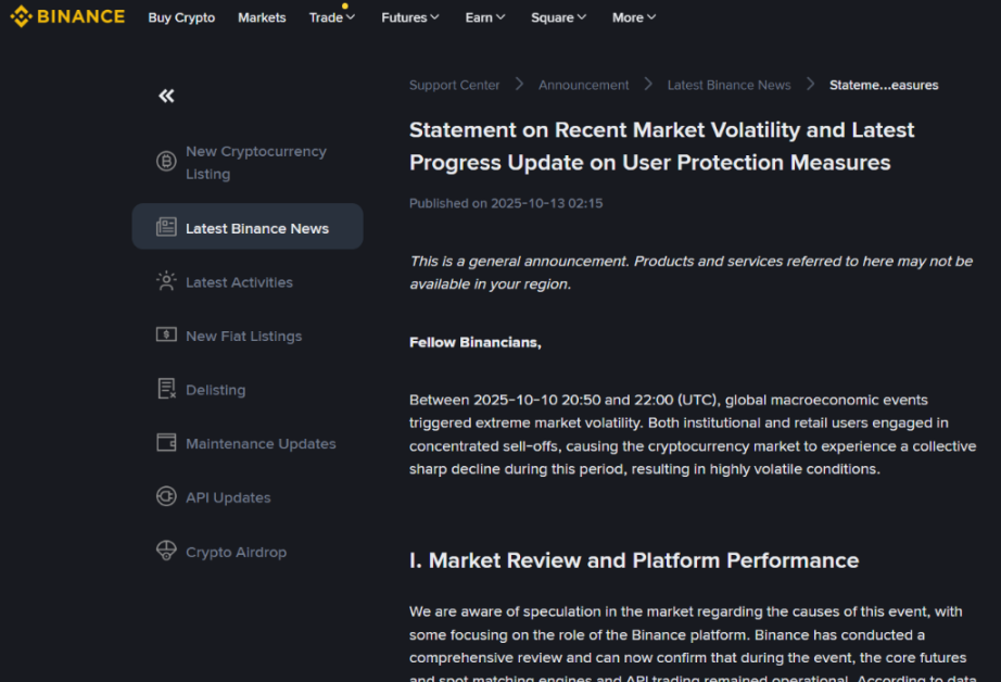 面对社交媒体上「关键时刻拔网线」的指责,10 月 13 日周一,币安发布声明作出回应,其承认平台出现技术问题,但同时强调,市场崩盘主要由宏观环境驱动,而非平台出现的系统性故障。