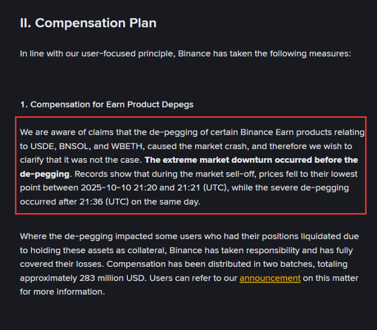 币安同时披露,已在事发后 24 小时内完成了对因资产脱钩问题而蒙受损失的用户的赔偿,两批赔偿总额约为 2.83 亿美元。