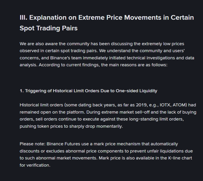 币安对此也给出了技术层面的解释。公告指出,主要原因有二:首先,由于市场出现单边流动性枯竭(缺乏买单),抛售订单持续执行,最终触发了平台上一些「历史悠久的限价单」,其中部分订单的设置时间可追溯至 2019 年,其极低的价格导致了代币价格瞬间暴跌。