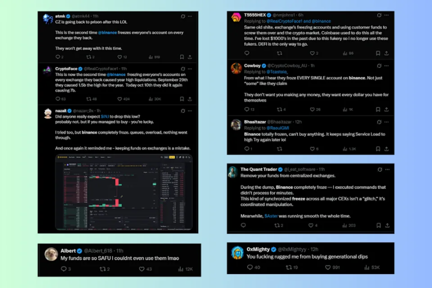 此次市场动荡始于上周五,据报道,美国总统特朗普在社交媒体上发布的关税威胁言论被视为导火索。比特币价格一度从超过 12.6 万美元的高点下跌 13.5%,数小时内,加密货币市场哀鸿遍野。在市场最需要流动性的时候,大量用户报告称,在币安等交易平台遭遇系统延迟、订单无法执行甚至账户被冻结,导致损失扩大。
