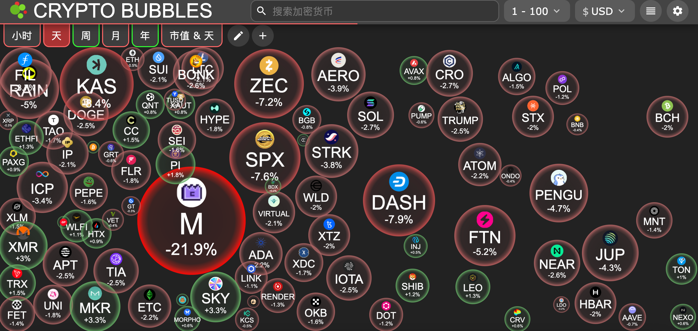 今日市值前100币种最大跌幅:MemeCore跌21.4%、Kaspa跌8.5%、Dash跌7.9%、SPX6900跌7.5%、Zcash跌7.3%。