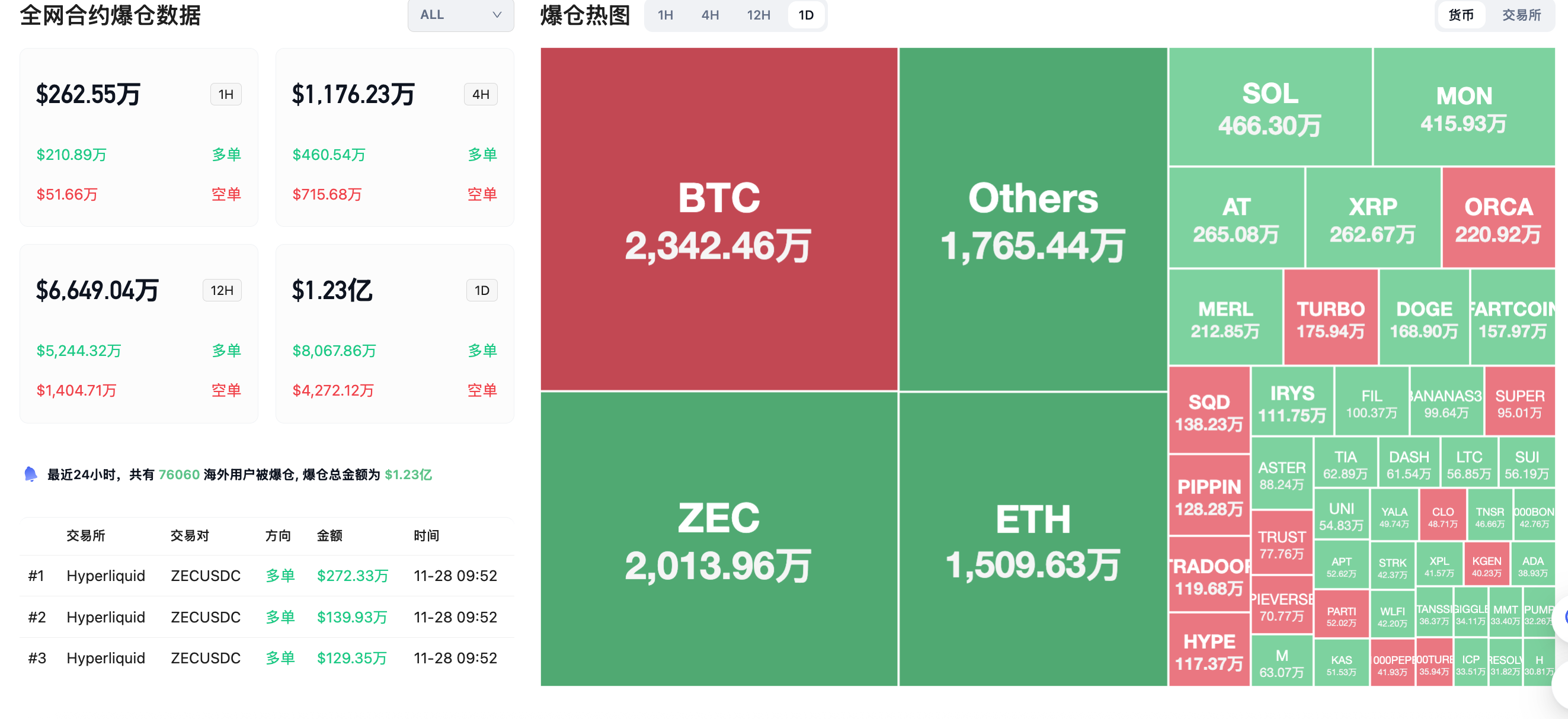24小时爆仓数据:全球共76060人被爆仓 ,爆仓总金额为1.23亿美元,其BTC爆仓2342万美元、ZEC爆仓2013万美元、ETH爆仓1509万美元