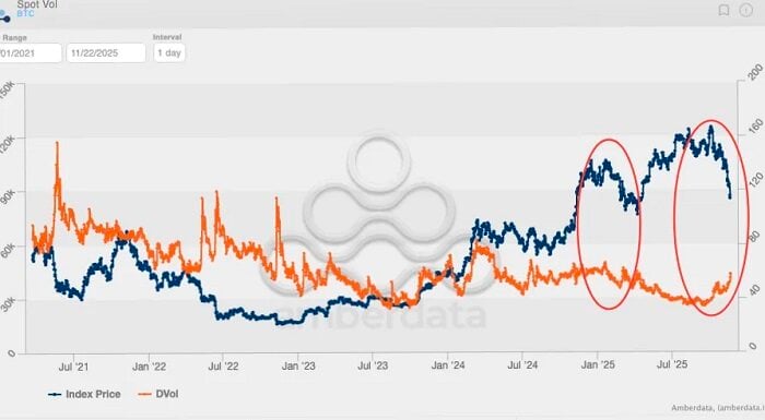 More notably, implied volatility (IV) continued to rise even as spot prices fell. Since the ETF era began, it has been rare for Bitcoin’s price to decline steadily while implied volatility climbs. This phase could well mark another critical "inflection point" in Bitcoin’s volatility dynamics: implied volatility is returning to the state it was in before ETFs existed.