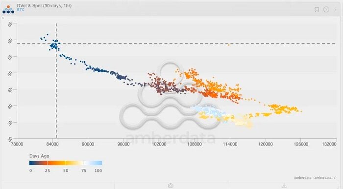 Refer to the chart above and note the color gradient (light blue to dark blue representing "days ago"). Tracking recent trends, you’ll notice a brief window where the spot Bitcoin vol-of-vol index climbed to around 125, while implied volatility also rose. At the time, these volatility indicators seemed to suggest a potential market breakout—after all, volatility and spot prices had previously shown a positive correlation. Yet, as we now know, the market did not rally as expected; instead, it reversed course and declined.